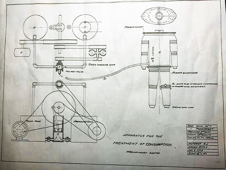 Thomas held several patents, including one for his unique piano plate and a gas-fired engine. In 1902, he designed an iron-lung prototype, most likely because of his son’s death from consumption (TB) five years earlier. (See image.) He sent the US Navy his plans for a midget submarine prior to WWI, which the Navy deemed impracticable at the time.