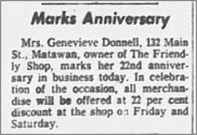By 1940, Mrs. Donnell owned the Friendly Shop clothing store. She ran this store for over 20 years. Later, it became the ARC Thrift Store.