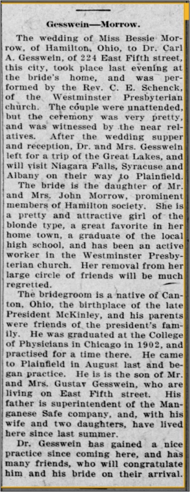 205-main-reynolds205-main-weddingDr. Carl A. Gesswein and his wife, Bessie, moved to Matawan in 1916. His WWI draft card shows this address. Eventually in the 1930s they remodeled the doctor’s office located in the rear of their home. According to the census, his sister Laura and niece Lillian Kenny lived here; his niece worked in his office as an assistant. He was the school physician with the Matawan Township Board of Education. He died in March 1956.